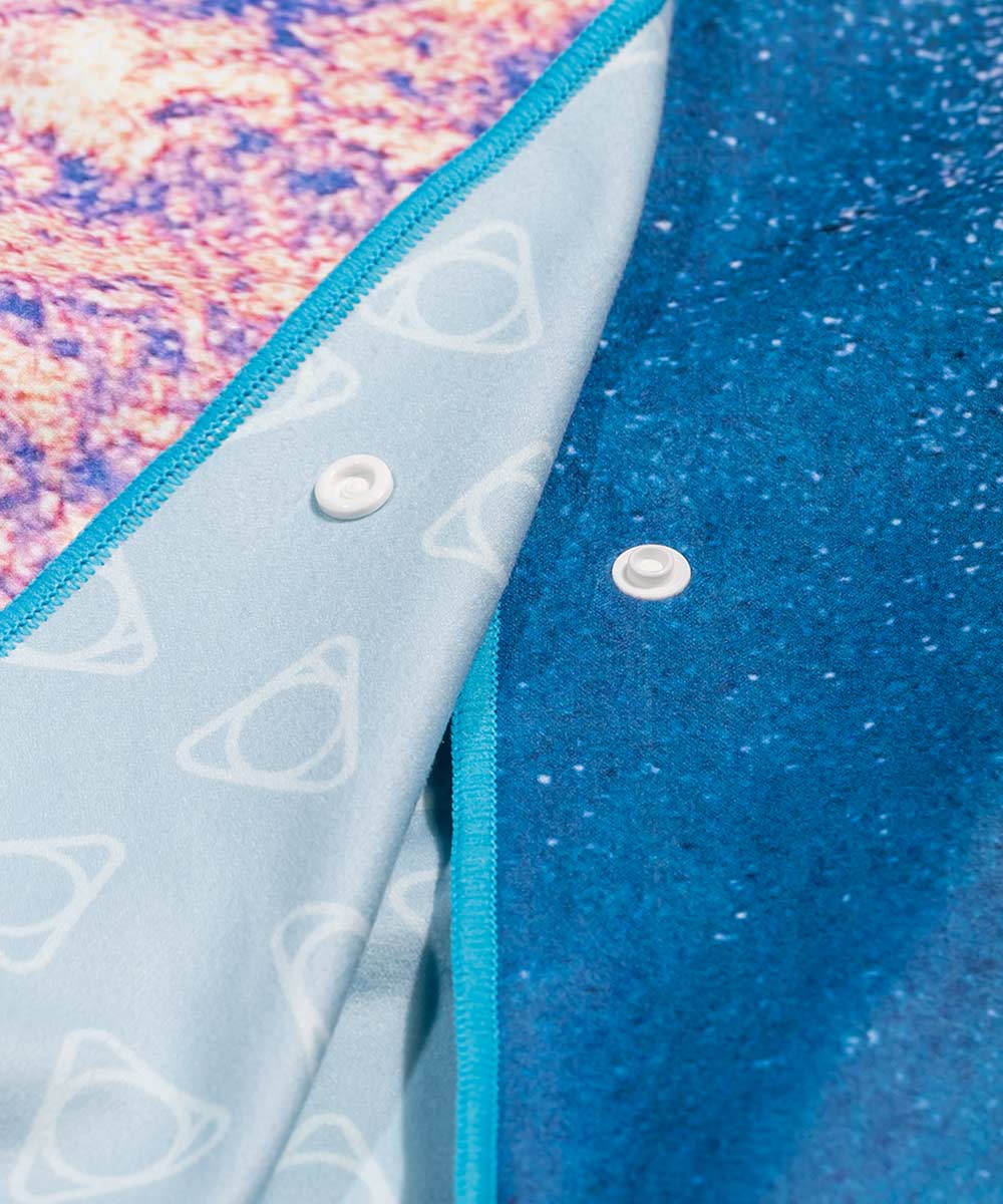 便㩦輕巧,比一部平板電腦還要輕! 彈性橡筋帶讓你輕鬆掛起毛巾,日本四合鈕扣*令毛巾貼服圍繞你的肩膀,讓你雙手可牽著你身邊的人和物!