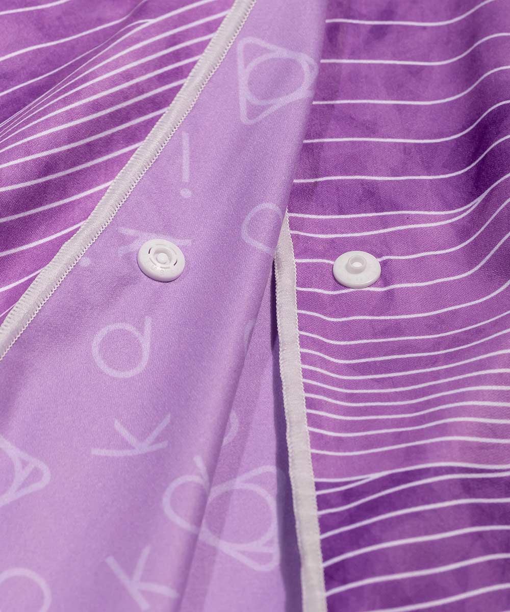 便㩦輕巧,比一部平板電腦還要輕! 彈性橡筋帶讓你輕鬆掛起毛巾,日本四合鈕扣*令毛巾貼服圍繞你的肩膀,讓你雙手可牽著你身邊的人和物!